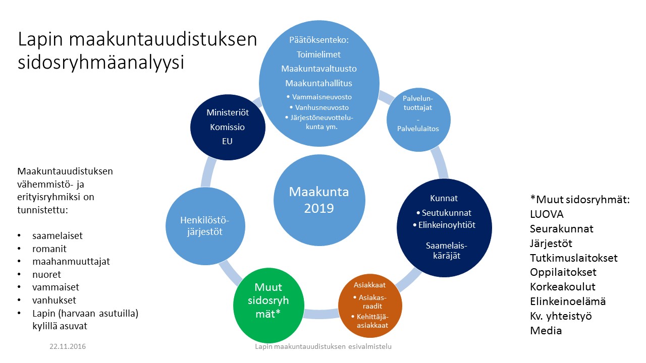 Lapin maakuntauudistuksen esivalmistelun ohjausryhmä on muodostanut kuvaa uudistuksen sidosryhmistä (ks. kuva).